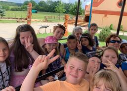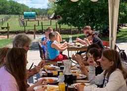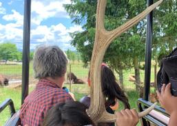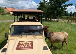 Pomalu se blížila doba plánovaného oběda, a tak jsme to otočili a zamířili do místní restaurace. Na obědě si všichni moc pochutnali, aby ne, měli jsme kuřecí řízek s hranolkami. „Mňam!“ Po obědě jsme šli hned na terénní projížďku místním offroad autem přímo do obory mezi zvířata. To byl zážitek, některá zvířata nám byla tak blízko, ta míň domestikovaná jsme pozorovali půjčenými dalekohledy. Dozvěděli jsme se hlavní rozdíly mezi jelenem wapiti a jelenem evropským. Mohli jsme si osahat jejich parohy. Už také bezpečně rozeznáme rohy od parohů. Také jsme zajeli mezi divoká prasata, kde bylo i spousta malých selátek. Řidič je krmil z jedoucího auta a ta za námi pelášila.