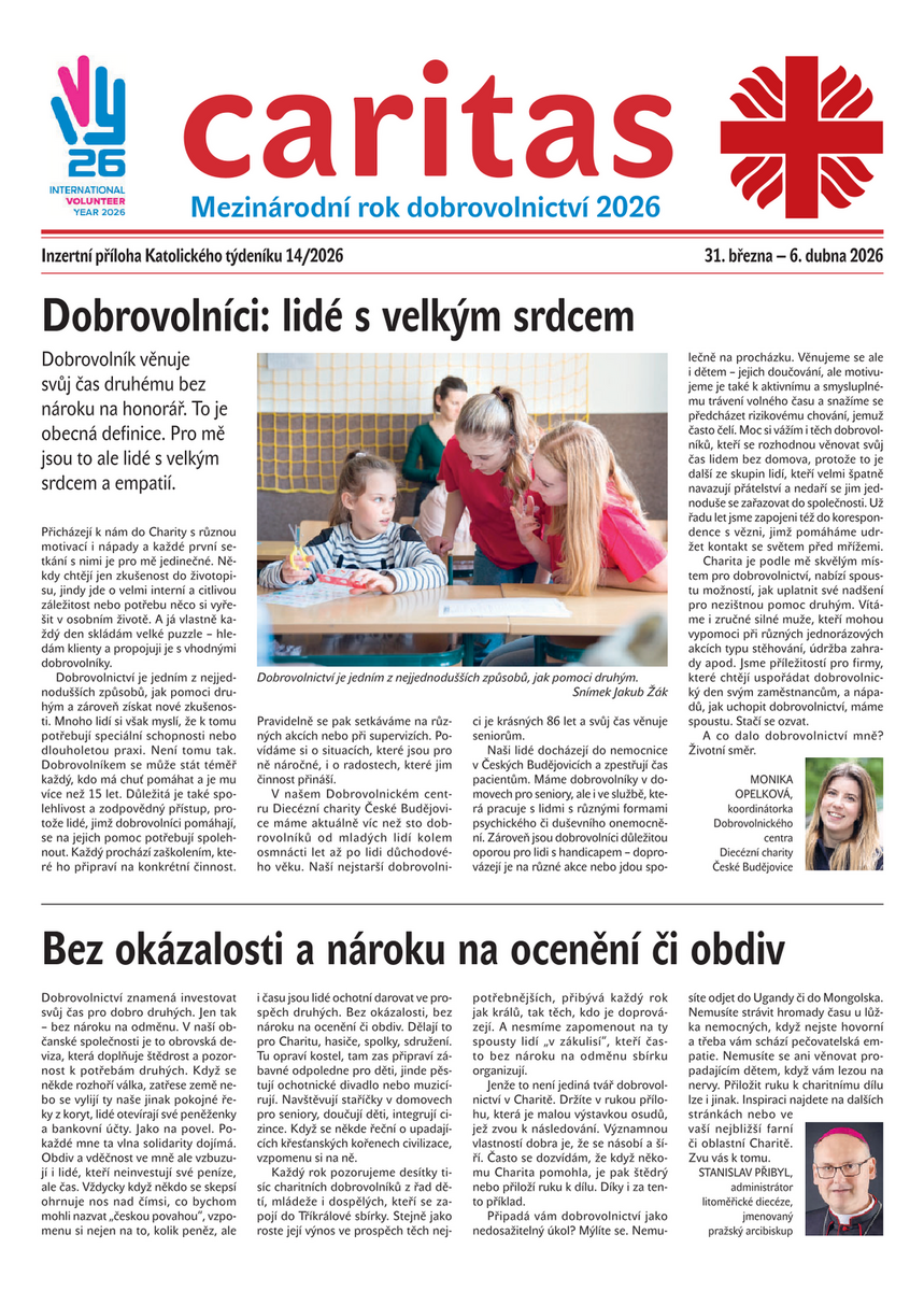Nejnovější příloha Katolického týdeníku věnovaná životu Charit má téma Dobrovolnictví. A to i proto, že letošní rok je Mezináordním rokem dobrovolnictví a Charita se bez pomoci těchto lidí neobejde. Úvodník této přílohy napsala koordinátorka Dobrovolnického centra Diecézní charity České Budějovice Monika Opelková.